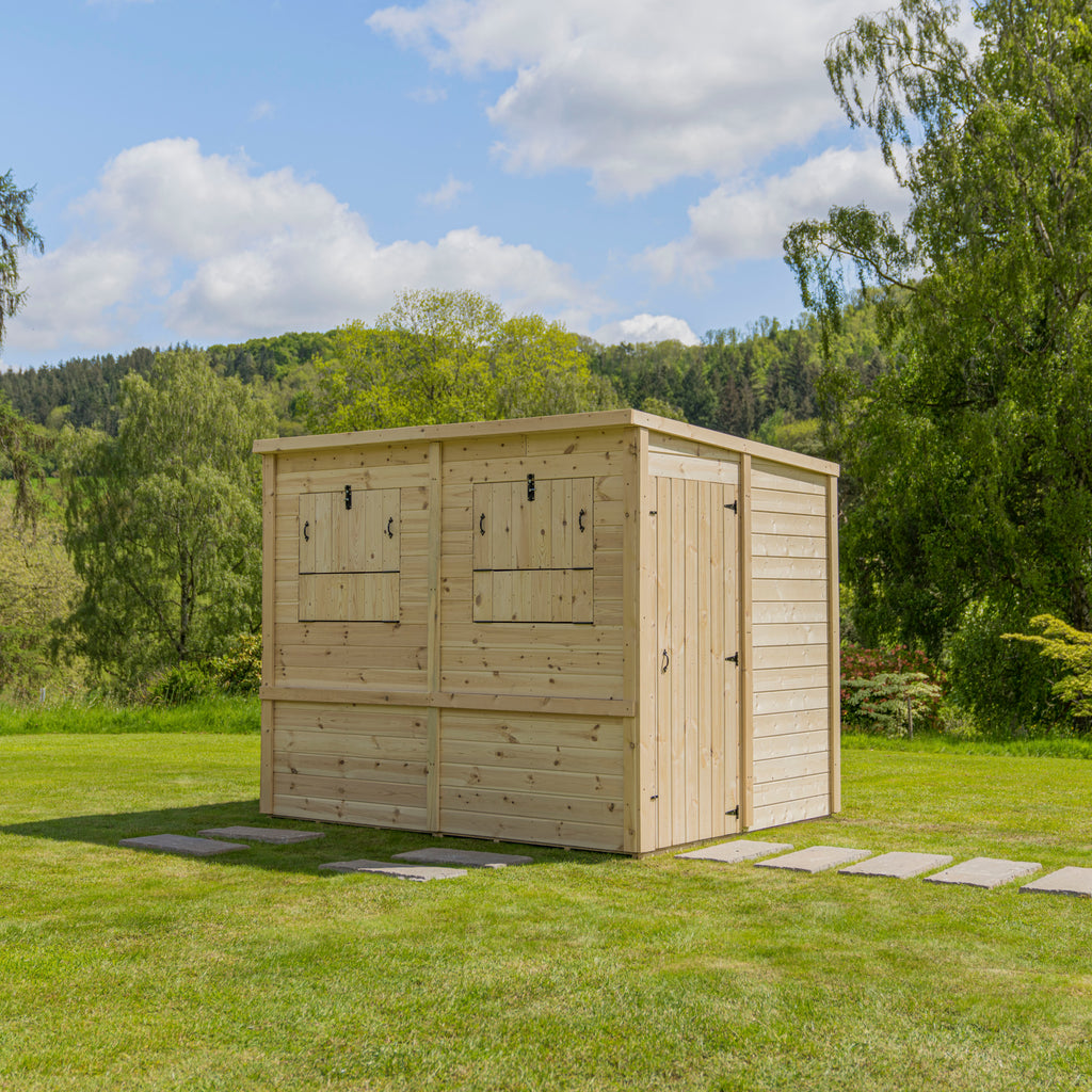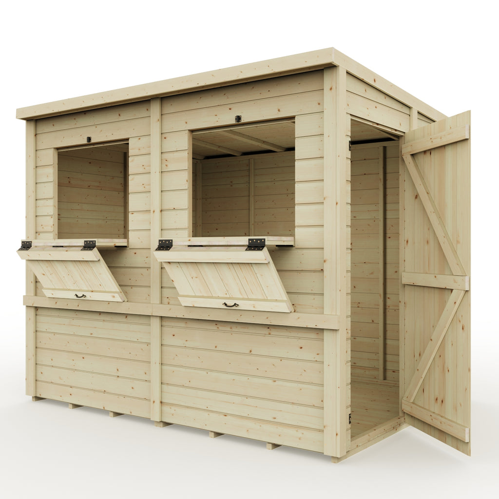 The Everest Party shed perfect to use in the garden for family get togethers or as a pop up bar at events, these versatile outdoor buildings have 2 or 3 opening front hatches (depending on the size) that fold down to create bar tops for serving.