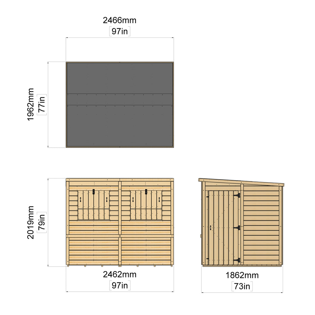 The 12mm Shiplap cladding Everest sheds use the same thickness of cladding for the walls, floor and roof, no chip or OSB board here. For added strength we use 32mm x 32mm framework (which itself is considerably thicker than our leading competitors framing) and when doubled at joints gives a 32mm x 64mm strong connection, put together with the 12mm shiplap it creates a sturdy structure perfect for daily use.